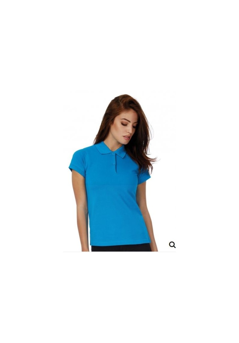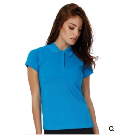 Polo de mujer de 180 g/m² en algodón 100%. Cuello de tricotosa y tapeta frontal de dos botones. Sin bolsillo. Manga corta terminada en un puño con canalé.