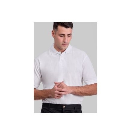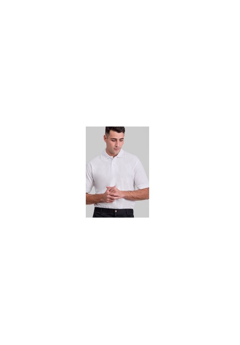 Polo de hombre de 180 g/m² en algodón 100%. Cuello de tricotosa y una tapeta frontal de tres botones. Sin bolsillo. Manga corta terminada en un puño con canalé.