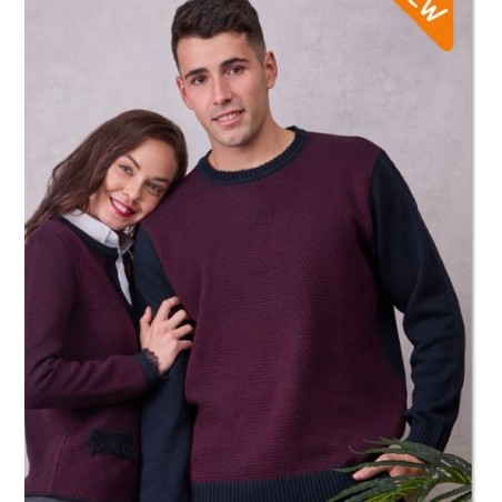 Jersey unisex de escote redondo, con mangas y el bajo acabados en rib. Combinado el frente en punto de arroz de color granate y azul marino con la espalda y las mangas en color azul marino. Fabricada en punto acrílico low pilling que garantiza sus propiedades para un uso prolongado.