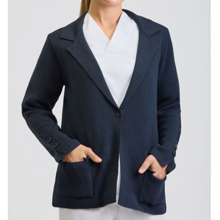 Chaqueta con solapas de mujer que se abrocha con un botón frontal. Con dos bolsillos de parche en la altura de las caderas y con las mangas largas con abertura en el puño cerradas por dos botones. Fabricada en punto acrílico low pilling que garantiza sus propiedades para un uso prolongado.