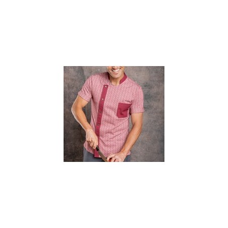 Chaqueta de cocina con cuello mao, manga corta, bolsillo y cierre con corchetes. Fabricada con algodón orgánico y fibra kapok.
