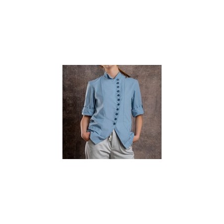 Chaqueta de cocina unisex con manga larga y recogemangas. Cierre asimétrico con 12 botones. Cuello pajarita. Espalda con canesú y tabla central. Fabricada con algodón orgánico.