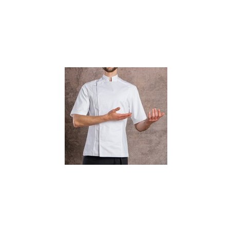 Chaqueta de cocina hombre, en manga corta, con pecherín en tejido algodón sostenible (certificado BCI) y poliester reciclado. Resto de prenda en tejido elástico transpirable con diseño gofrado.