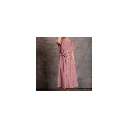 Vestido midi camisero con goma en cintura, botones asimétricos y manga corta caída. Bolsillos en costura. Fabricado en algodón orgánico y fibra Kapok.