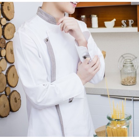 Chaqueta cocina unisex manga larga, cierre asimétrico con automáticos ocultos. Contrastada