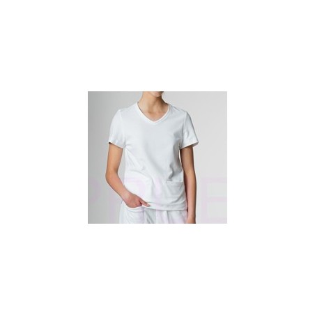 Camiseta mujer con escote pico, manga corta y dos bolsillos de tapeta. Tejido Natura®. Gracias a su tejido, esta camiseta resulta muy fresca, transmite la humedad al exterior, retiene el color, no necesita planchado y no se deforma. ¡Te permitirá estar perfecta durante toda la jornada! Te encantá si buscas una prenda polivalente, moderna y fresca. Es ideal tanto para llevarla en el sector sanitario, así como en limpieza y cocina. ¿Buscas el look completo? Llévala con el pantalón 1714 o 1716, ambos también fabricados en Natura. También tienes la versión de hombre 1732 y 1711.
