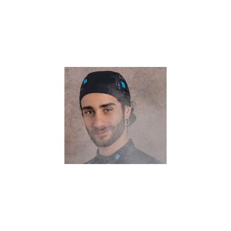Gorro bandana ajustable mediante cintas posteriores. Tejido principal Natura® negro. Tejido laterales en algodón con diseño molecular.