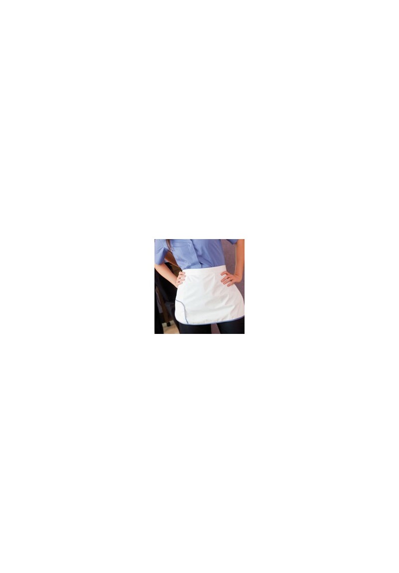 Delantal corto con dos pliegues y biés contrastado en contorno de faldón y alrededor del bolsillo.
